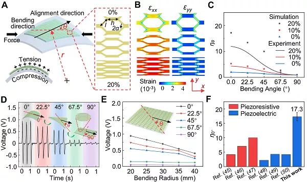 圖3. A 彎曲模式下壓電輸出示意圖。B 仿真應(yīng)變分布圖。C 仿真各向異性。D 不同彎曲方向的電壓輸出信號(hào)。E 不同彎曲方向和彎曲幅度的電壓輸出。F 多種各向異性傳感器的對(duì)比。