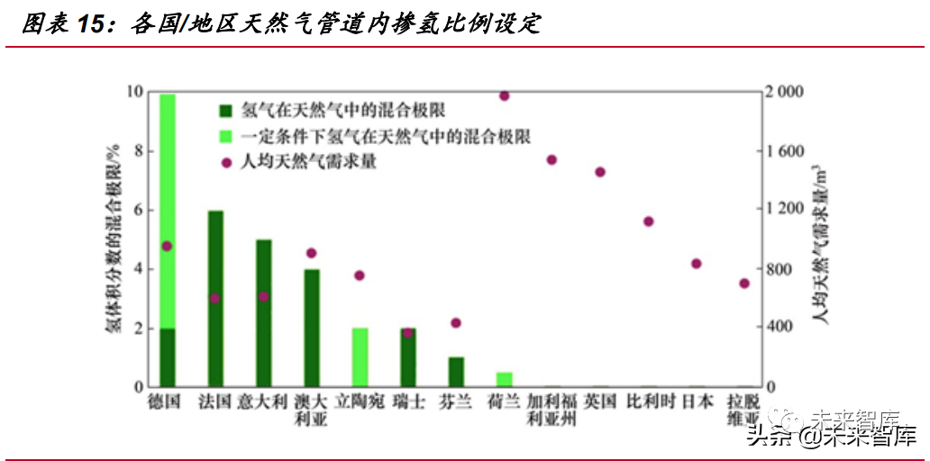 氫能產(chǎn)業(yè)發(fā)展初期階段,管道氫可由天然氣管道摻氫來實現(xiàn)過渡。由于純氫管 道的初始投資較大,不適合作為氫能發(fā)展初期應(yīng)用,在管道運輸發(fā)展初期,可以積極 探索摻氫天然氣方式,即利用已建設(shè)的天然氣輸配管網(wǎng)與基礎(chǔ)設(shè)施進(jìn)行天然氣和氫氣 混合輸送,也可經(jīng)改造后輸送純氫,可實現(xiàn)低成本、規(guī)?;?、連續(xù)性氫能供應(yīng)。研究 結(jié)果表明,在含量較低時(10-20%摻氫比例),氫氣可以在不做重大技術(shù)調(diào)整的情況 下?lián)交熘撂烊粴?。未來大力發(fā)展天然氣摻氫管道輸送技術(shù),關(guān)鍵需要解決管材、調(diào)壓 站、流量計、探測器等配套裝備的摻氫相容性與適應(yīng)性并完善管網(wǎng)安全運行保障技術(shù)。 天然氣摻氫管道輸送技術(shù)是目前進(jìn)行大規(guī)模、長距離氫氣輸送最為有效手段之一。