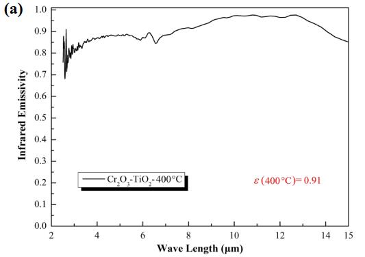 高輻射涂層可提高部件表面紅外發(fā)射率,通過紅外輻射的形式將基體的熱量快速高效的輻射出去,降低部件溫度,從而提高其使用壽命。美國 NASA 研究結(jié)果表明, 輻射系數(shù)相差 0.55 會造成 300 ℃ 左右的溫差 。因此, 在納米 YSZ涂層表面添加高輻射涂層,可有效降低納米 YSZ涂層使用溫度, 形成高效地散熱 - 隔熱一體化涂層體系, 為納米 YSZ 涂層在更高溫度下服役提供了保障。