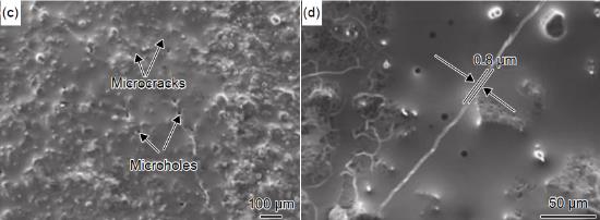 圖 2 試樣在室溫至 1773 K 熱震循環(huán) 30 次后的表面形貌:(a)、(b)PC-SiC-Si 涂層試樣;(c)、(d)GSI-SiC-Si 涂層試樣