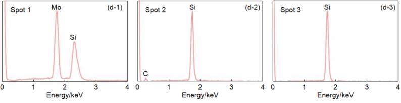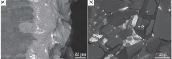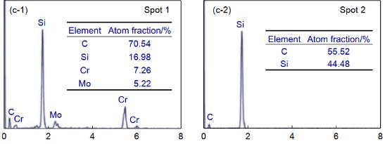 圖3 SiC-CrSi2-Cr3C2-MoSi2-Mo2C 涂層的形貌和相組成?。╝)橫截面圖像;(b)表面圖像;(c-1)點(diǎn) 1 對(duì)應(yīng)的 EDS 分析;(c-2)點(diǎn) 2 對(duì)應(yīng)的 EDS 分析