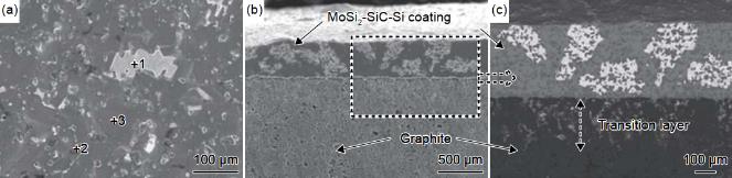 Jiang 等通過(guò)料漿浸漬在石墨表面制備出MoSi2-SiC-Si 涂層,然后采用氣相滲硅技術(shù)使之形成致密的涂層結(jié)構(gòu)(圖 4)。實(shí)驗(yàn)結(jié)果顯示,在室溫至 1600 ℃ ,涂層始終呈現(xiàn)出良好的抗氧化效果,1600 ℃ 氧化 220 h 后試樣失重為 0.96%。并在涂層中加入了 CrSi2 相,制備了 MoSi2- CrSi2-SiCSi 涂層。氧化過(guò)程中形成了氧擴(kuò)散系數(shù)較低的氧化層且氧化層中有分散的 MoSi2 和 CrSi2 相 , 在1600 ℃ 氧化 1190 h 后有 1.64% 的增重。