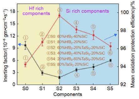 圖 6 HfB2-SiC-TaSi2 涂層試樣的惰性因子和平均抗氧化效率曲線