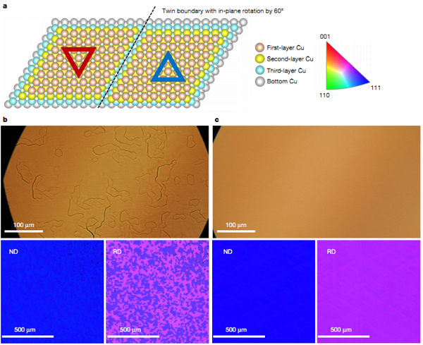 研究固體材料中電磁波和自由電子的共振相互作用的等離激元理論領(lǐng)域,由于等離激元材料中通常會(huì)發(fā)生大量損耗,因此尚未投入大規(guī)模商業(yè)應(yīng)用。由于其良好的色彩飽和度,通用的形狀因數(shù)和低功耗,有機(jī)發(fā)光器件(OLED)已被并入數(shù)十億個(gè)商業(yè)產(chǎn)品中,但在效率和穩(wěn)定性方面仍可以得到改善。盡管結(jié)合了有機(jī)熒光粉的OLED實(shí)現(xiàn)了內(nèi)部的電荷到光的統(tǒng)一轉(zhuǎn)換,但它們的折射率對(duì)比卻將設(shè)備外光子的可觀察部分降低了約25%。此外,在OLED操作期間,緩慢衰減的三重態(tài)激子和電荷的局部累積會(huì)在稱為老化的過(guò)程中逐漸降低設(shè)備的亮度,這可能會(huì)導(dǎo)致顯示屏出現(xiàn)“烙印”現(xiàn)象。同時(shí)提高設(shè)備效率和穩(wěn)定性對(duì)于OLED技術(shù)至關(guān)重要。美國(guó)UDC(Universal Display Corporation)演示了一種OLED,它利用等離子體系統(tǒng)的衰減率提高來(lái)提高設(shè)備穩(wěn)定性,同時(shí)通過(guò)結(jié)合基于納米粒子的外耦合方案從等離子體激元模式中提取能量來(lái)保持效率。使用原型磷光發(fā)射器,可以在與參考常規(guī)設(shè)備相同的亮度下將操作穩(wěn)定性提高兩倍,同時(shí)還可以從等離激元模式中提取16%的能量作為光。這個(gè)工作提高OLED穩(wěn)定性的方法避免了特定于材料的設(shè)計(jì),并且適用于當(dāng)前用于照明面板,電視和移動(dòng)顯示器的所有商用OLED。Plasmonic enhancement of stability and brightness in organic light-emitting devices.(Nature, 2020, DOI:10.1038/s41586-020-2684-z)4.臺(tái)積電&臺(tái)灣陽(yáng)明交通大學(xué)&萊斯大學(xué)Nature:Cu(111)上的晶圓級(jí)單晶六方氮化硼六方氮化硼單層
