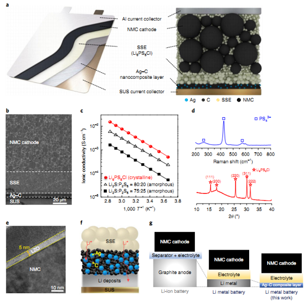 具有鋰金屬陽(yáng)極的全固態(tài)電池是超越常規(guī)鋰離子電池性能的強(qiáng)大選擇。然而,不希望的鋰枝晶生長(zhǎng)和低庫(kù)侖效率阻礙了它們的實(shí)際應(yīng)用。三星先進(jìn)研究院發(fā)現(xiàn),具有硫化物電解質(zhì)的高性能全固態(tài)鋰金屬電池是由不含過(guò)量鋰的Ag-C復(fù)合陽(yáng)極實(shí)現(xiàn)的。薄的Ag-C層可以有效地調(diào)節(jié)Li的沉積,從而導(dǎo)致真正的長(zhǎng)電化學(xué)循環(huán)性。在全電池演示中,作者使用了具有高比容量(> 210 mAh/g)和高面容量(> 6.8 mAh/cm2)的高Ni層狀氧化物陰極,以及一種銀輝石型硫化物電解質(zhì)。還引入了熱等靜壓技術(shù)以改善電極與電解質(zhì)之間的接觸。由此制備的原型袋式電池(0.6 Ah)表現(xiàn)出高能量密度(> 900 Wh/l),超過(guò)99.8%的穩(wěn)定庫(kù)侖效率和長(zhǎng)循環(huán)壽命(1000次)。High-energy long-cycling all-solid-state lithium metal batteries enabled by silver-carbon composite anodes.