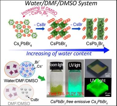 圖1. 水/DMF/DMSO三溶劑法合成各相銫鉛溴鈣鈦礦及高質(zhì)量Cs4PbBr6熒光晶體