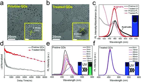 d)的瞬態(tài)吸收(TA,激發(fā)354 nm)漂白恢復(fù)曲線的演變,e)原始和f)處理的QDs在紫外線(UV)照射不同時(shí)間后的PL光譜。插圖:紫外線照射不同時(shí)間后的原始和經(jīng)過(guò)處理的量子點(diǎn)的照片。