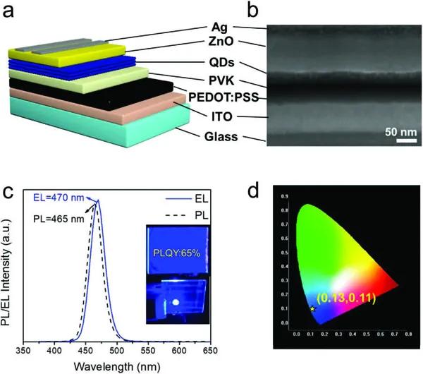 金屬鹵化物鈣鈦礦發(fā)光二極管(PeLEDs)因其熒光產(chǎn)率高、色域?qū)挘ā?40%)、發(fā)射峰窄等優(yōu)點(diǎn),成為超高清顯示的理想元件之一。近年,最先進(jìn)的綠光和紅外光PeLEDs的外量子效率(EQE)超過(guò)20%,但是純紅光和藍(lán)光PeLEDs的亮度、EQE仍然很低。盡管天藍(lán)色PeLEDs(波長(zhǎng)范圍:480-490nm)的EQE已經(jīng)提升到10%以上,但這個(gè)波長(zhǎng)范圍還不能滿足國(guó)家電視系統(tǒng)委員會(huì)(NTSC)標(biāo)準(zhǔn)純藍(lán)光(波長(zhǎng)460-470 nm)的要求,這嚴(yán)重阻礙了PeLEDs在顯示技術(shù)中的應(yīng)用。因此,設(shè)計(jì)滿足NTSC標(biāo)準(zhǔn)的高性能純藍(lán)PeLED仍然是一個(gè)尚未解決的挑戰(zhàn)。