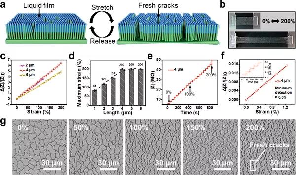 電阻應(yīng)變傳感器具有出色的靈敏度和順應(yīng)性,因此在柔性和可拉伸電子產(chǎn)品的開發(fā)中起著至關(guān)重要的作用。然而,由于固體導(dǎo)電層與聚合物之間的低粘合強(qiáng)度以及常規(guī)固體導(dǎo)電層內(nèi)部不可彌補(bǔ)的干摩擦,這種傳感器的耐用性較差。針對該問題,中國科學(xué)院理化技術(shù)研究所生物啟發(fā)智能界面科學(xué)實(shí)驗(yàn)室田野團(tuán)隊(duì)受動物角膜淚膜的結(jié)構(gòu)和出色的耐磨性的啟發(fā),設(shè)計(jì)了基于由改性聚二甲基硅氧烷(PDMS)制成的仿生微絨毛上形成的均勻自修復(fù)無磨損液態(tài)膜的超耐久應(yīng)變傳感器。將包含離子液體的乙醇溶液添加到PDMS微絨毛中,由于表面化學(xué)性質(zhì)和特殊結(jié)構(gòu),該微絨毛具有超親液性。在蒸發(fā)過程中,離子液體通過壓力向上驅(qū)動,并形成連續(xù)的導(dǎo)電膜。作為傳感層,當(dāng)反復(fù)拉伸和釋放時(shí),由于濕摩擦而使毛細(xì)管穩(wěn)定化的液膜無損,并且在釋放后,由于毛細(xì)管力引起的自我修復(fù)能力,裂縫將完全恢復(fù),從而使應(yīng)變傳感器能夠具有超過22500個(gè)裝卸循環(huán)的高耐久性。這項(xiàng)工作提出了一種構(gòu)建超耐用電子產(chǎn)品的方法。