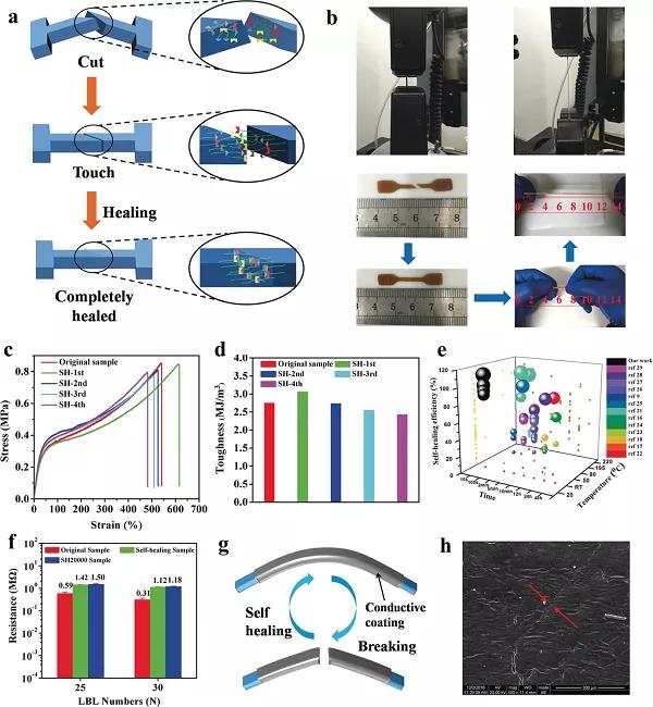 圖13. 自修復(fù)性能測試。a)自我修復(fù)過程。b)拉伸前后自我修復(fù)的多氫鍵彈性體的照片。c)原始,第一,第二,第三和第四愈合的多氫鍵彈性體的典型應(yīng)力-應(yīng)變曲線和d)韌性。e)比較不同自修復(fù)聚合物彈性體的機(jī)械自修復(fù)效率。f)25和30 LBL循環(huán)的應(yīng)變傳感器的電氣自修復(fù)性能。g)電氣自我修復(fù)過程。h)帶有25個(gè)LBL循環(huán)的已修復(fù)傳感器的SEM圖像。