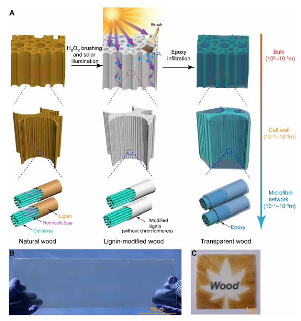 Scalable aesthetic transparent wood for energy efficient buildings