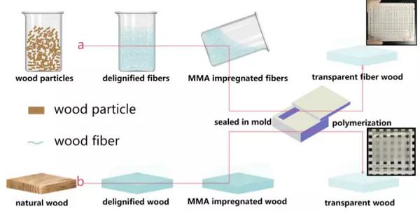 圖4 透明纖維木材(a)和傳統(tǒng)透明木材(b)的合成方法和照片。