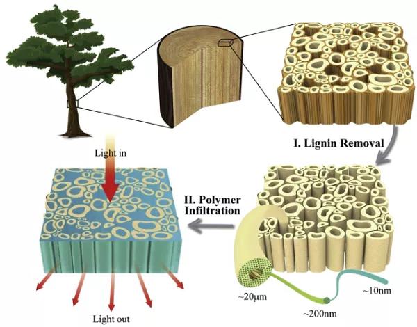 圖11 通過(guò)脫木素方法制備透明木材的示意圖。