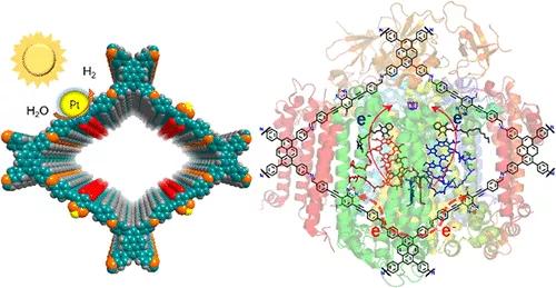 開發(fā)通過可見光分解水來制備清潔氫能的光催化劑是太陽能轉化為清潔可持續(xù)燃料的首要挑戰(zhàn)之一。受自然界光系統(tǒng)I結構特征的啟發(fā),設計并合成了一系列基于電子供體-受體的穩(wěn)健共價有機框架材料(NKCOFs),其中芘的供電子基團可用于光捕獲。同時,將具有不同官能團的苯并噻二唑作為電子受體,來調控COFs的光吸收能力。引人注目的是,NKCOF-108的可見光制氫活性是純相COFs中最高的,這主要源自其獨特的結構特征和寬的可見光響應范圍。高度有序的層狀結構確保有充足的制氫活性位點,而供體-受體設計可促進光生載流子的分離。這項發(fā)現(xiàn)為光解水制氫催化劑的設計提供了一種有效的策略。