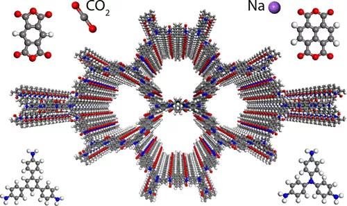 共價有機框架是一類新興的材料家族,具有多種潛在的應用價值。它們的多孔框架和氧化還原特性的活性中心具有氣體/離子吸附特性,使其成為下一代電池中安全、廉價和可控的電極材料,以及碳捕獲中的CO2吸附材料。通過將芳香族三胺與芳香族二酐結合,發(fā)展了四種聚酰亞胺COFs,并進行了細致的結構和電化學表征。通過DFT計算和粉末XRD的結構表征,顯示酰亞胺鍵傾向于以一定角度形成,從而破壞了二維對稱性,縮小了孔徑并拉長了孔壁。兩種性能最佳的COFs源自相同的三胺結構單元,結合力場計算,揭示了意想不到的結構-性質關系。特定的幾何形狀為鈉離子嵌入提供了有用的框架,在相對較高的工作電位(> 1.5 V vs Na/Na+)下具有可保持的容量和穩(wěn)定的循環(huán)壽命。盡管與傳統(tǒng)的無機鋰離子材料相比,這種容量還較低,但這些COFs由于具有不溶于水的特性,在可持續(xù)、安全和穩(wěn)定的水系鈉離子電池中具有優(yōu)勢。