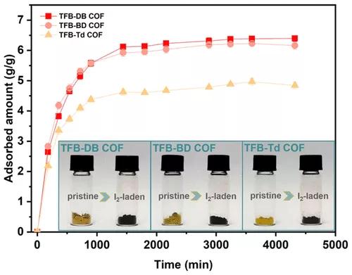 核廢料中的放射性物質會對人類的生殖和代謝系統(tǒng)等健康造成危害。如何快速高效地設計放射性物質吸附劑仍然是一個巨大的挑戰(zhàn)。這項成果提出了一種通過理論篩選設計高效放射性碘吸附劑的策略。三種經過篩選的COFs表現(xiàn)出超高碘吸附能力,由于其具有特定的孔徑和官能團,蒸汽中的碘吸附量高達6.4 g/g(質量百分比為640%),溶液中則高達99.9 mg/g。