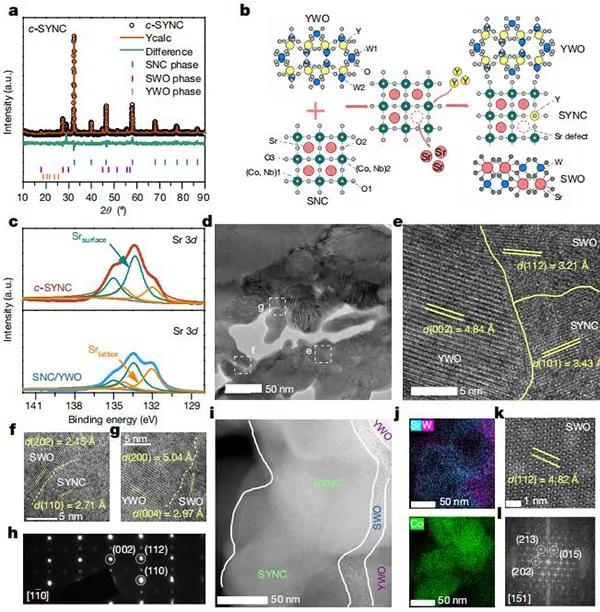 (a)c-SYNC復(fù)合粉末的XRD圖譜及精修;(c)煅燒前c-SYNC和“原始” SNC/YWO的Sr 3d軌道的XPS圖譜;(e-g)YWO,SWO和SYNC相界面的HR TEM圖像;(h)f中SYNC相的[110]區(qū)域軸的SEAD模式;(k,l)STEM圖像和相應(yīng)的SWO相FFT圖像。圖二、c-SYNC的熱膨脹行為及相應(yīng)的電化學(xué)性能
