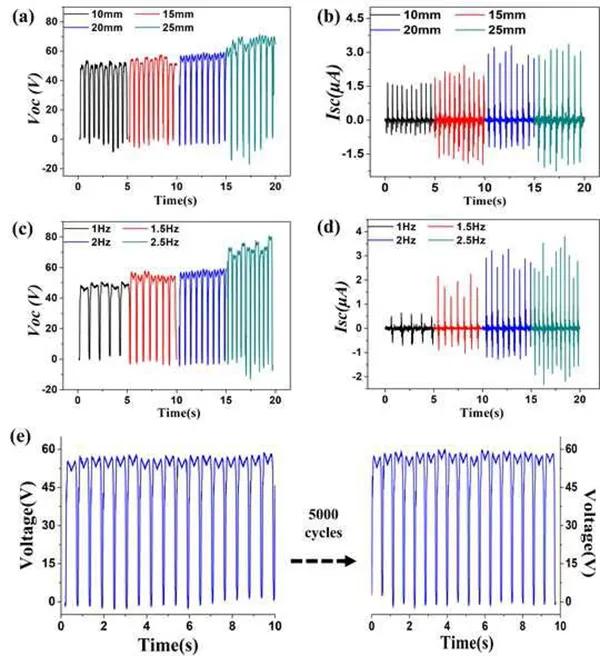 (a,b)MT-TENG的開路電壓和短路電流隨位移幅值的變化而變化;(c,d)MT-TENG的開路電壓和短路電流隨頻率的變化而變化;(e)通過5000個連續(xù)工作周期,研究了MT-TENG的穩(wěn)定性;