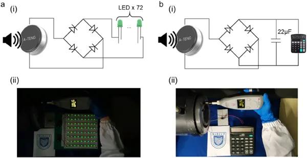 (a)聲學(xué)系統(tǒng)直接點亮了72個綠色LED。(b)不帶電池的商用計算器由聲學(xué)系統(tǒng)連續(xù)驅(qū)動。圖5 A-TENG對1 kHz內(nèi)聲頻范圍的響應(yīng)
