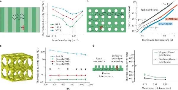 (a)一維超晶格中的相干(波浪線)和擴(kuò)散(直線)聲子散射(左)。(b)二維納米聲子晶體(NPC)中聲子輸運(yùn)的三種可能機(jī)制是由聲子波長λ、聲子平均自由路徑Λ和NPC周期d(左)之間的關(guān)系決定的。(c)三維NPC以及具有不同孔隙率的三維NPC和體硅的熱導(dǎo)率隨溫度的變化。(d)柱狀結(jié)構(gòu)導(dǎo)熱系數(shù)降低的三種機(jī)制示意圖,雙柱撐膜(兩側(cè)有柱)和單柱撐膜(僅一側(cè)有柱)的導(dǎo)熱系數(shù)比相同厚度的均勻膜低兩個數(shù)量級。