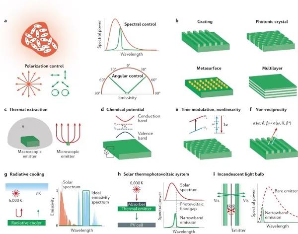 (a)傳統(tǒng)的黑體熱輻射(橙色)和納米結(jié)構(gòu)控制的熱輻射(綠色)。(b)用于熱輻射控制的納米結(jié)構(gòu),包括光子晶體、光柵、超材料和多層膜。(c)超越普朗克定律:在宏觀發(fā)射器和微觀熱天線中通過熱提取增強(qiáng)吸收截面。(d)在具有非零化學(xué)勢μγ的半導(dǎo)體中,通過分離電子ηc和空穴ηv的準(zhǔn)費(fèi)米能級,可以獲得非平衡熱輻射。(e)非平衡熱輻射可以通過時(shí)間調(diào)制引起的頻率躍遷和非線性來實(shí)現(xiàn)。(f)超越基爾霍夫定律:非互易熱輻射。在非互易系統(tǒng)中,角光譜吸收率α和發(fā)射率ε之間的平衡可能被打破。(g)白天輻射冷卻可以使用在整個太陽光譜上吸收率接近零的材料,并且在8-13 μm光譜范圍內(nèi)具有強(qiáng)發(fā)射率。(h)太陽能熱光伏系統(tǒng):一個中間元件吸收入射的陽光加熱,然后根據(jù)太陽能電池的帶隙產(chǎn)生熱輻射。(i)超越基爾霍夫定律:非互易熱輻射。在非互易系統(tǒng)中,角光譜吸收率α和發(fā)射率ε之間的平衡可能被打破。