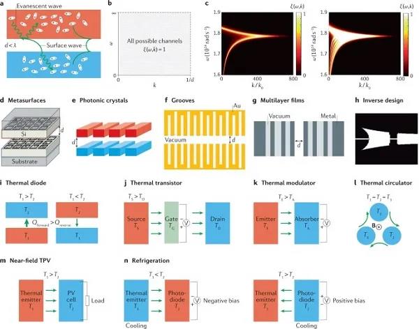 (a)跨度為d或小于峰值熱波長λ的真空間隙的近場輻射傳熱示意圖。(b)在頻率-波矢(ω-k)空間上所有可能通道的近場輻射傳熱的理論極限。(c)一對間隔為10 nm的SiC平板之間的光子傳輸概率ξ(ω,k)的圖。(d-h)增強(qiáng)近場輻射傳熱的平臺包括超表面、光子晶體、溝槽、多層膜和通過逆向設(shè)計(jì)獲得的結(jié)構(gòu)。(i-n)近場傳熱器件的概念包括熱二極管、熱晶體管、熱調(diào)制器、熱循環(huán)器、近場熱光伏、器件和近場正、負(fù)發(fā)光冰箱。