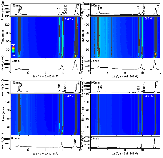 圖3 Ni0.6Co0.2Mn0.2(OH)2和LiOH·H2O在不同溫度下的同步輻射衍射隨反應(yīng)時間變化圖:a 500 °C,b 600 °C,c 700 °C,d 800 °C。