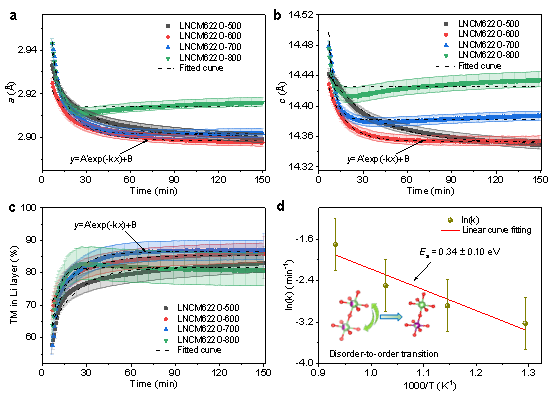 圖4 高溫鋰化反應(yīng)動力學(xué)研究:無序?qū)訝頛i1-x(Ni0.6Co0.2Mn0.2)1+xO2結(jié)構(gòu)中a 晶胞參數(shù)a,b 晶胞參數(shù)c,c Li/TM混排在不同溫度下隨時間的變化;d Li/TM離子由無序到有序轉(zhuǎn)化活化能計算圖。