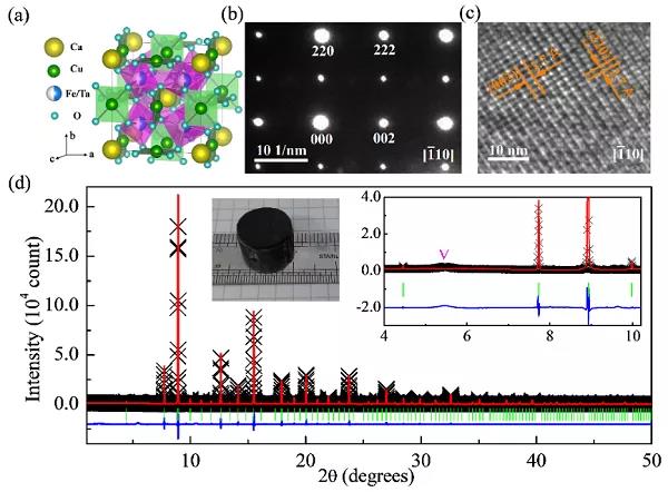 圖1 (a) CaCu3Fe2Ta2O12的晶體結構圖,(b) 選區(qū)電子衍射圖,(c) 高分辨透射電子顯微鏡圖,(d) 同步輻射X射線衍射圖。