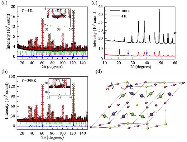 圖2 CaCu3Fe2Ta2O12在(a) 4 K和(b) 300 K時的中子衍射精修圖,(c) 4 K和300 K的低角度的中子衍射數(shù)據(jù),其中藍色箭頭表示核衍射和磁衍射之間的差異。(d) CaCu3Fe2Ta2O12在4 K時的磁結構。其中虛線坐標軸表示晶格基矢量(a,b,c),實線坐標軸表示磁基矢量(aM,bM,cM)。