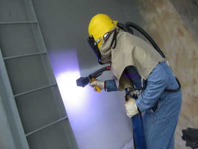 筆者建議金屬熱噴涂必須選擇干噴砂進行表面處理,磨料粒徑最好選擇0.5-2㎜冷激鋼砂。粒度配合是0.5-1㎜約占30%,1-2㎜約占40%-50%,粗磨料約占10%-15%之間。噴槍嘴徑大約在8-12㎜,除銹等級符合GB8923標準中的Sa2.5級,表面粗糙度RZ(50-80)μm。根據(jù)干噴砂對于鋼鐵表面活化能及防止二次返銹,干噴砂后按照國標4h、ISO 8h內(nèi)必須進行金屬熱噴涂。