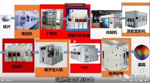 氧化擴散機,薄膜沉積設備,光刻機,涂膠顯影機,刻蝕機,離子注入機,CMP拋光設備,檢測設備,總共是八大設備。除此之外,還有一個清洗機,貫穿多個工序,不清洗是沒辦法進入下一環(huán)節(jié)的,因此總共是九大核心設備。
