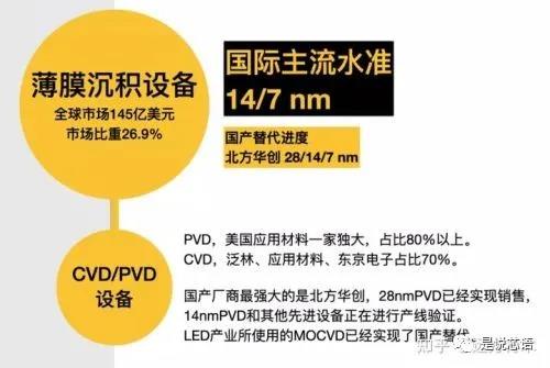 薄膜沉積設備領域最強的是美國和日本,都可以搞定5nm技術,兩國合計占據(jù)70~80%左右的市場份額。目前,中國國內的存量薄膜沉積設備98%來自于進口,國產(chǎn)化率僅為2%,因為中國以前造不出來。但最近幾年,中國取得了技術突破,最先進廠商為北方華創(chuàng)。目前,中國28nm級別的設備已經(jīng)成功實現(xiàn)銷售,14nm設備正在生產(chǎn)線進行磨合驗證。