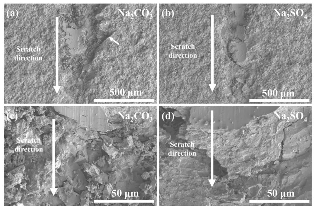 為了進(jìn)一步驗(yàn)證涂層 - 基體間的界面結(jié)合性能, 考察涂層 - 基體界面的劃痕性能、 壓痕性能和拉伸結(jié)合性能。圖 4 為在 900℃ 熔鹽中處理 4h 的 SiC 陶瓷表面制備的 Si 涂層的劃痕形貌。進(jìn)行劃痕實(shí)驗(yàn)前, 用細(xì)砂紙把涂層磨薄至 20~50μm,以觀察界面結(jié)合性。從低倍形貌( 圖 4(a)和 4(b))可以看出,Na2CO3 熔鹽處理的 Si 涂層劃痕形貌較深, 并且劃痕處涂層剝落現(xiàn)象明顯;而 Na2SO4 熔鹽腐蝕試樣的劃痕深度較淺,未見劃痕處有明顯的涂層剝落現(xiàn)象。從高倍形貌(圖4(c) 和4(d))可以看出, Na2CO3 熔鹽腐蝕試樣的涂層碎裂現(xiàn)象明顯,在劃痕處存在大量的碎屑,而 Na2SO4 熔鹽腐蝕試樣的內(nèi)部顆粒呈現(xiàn)階梯狀碎裂, 且未發(fā)現(xiàn)明顯的碎屑分布在劃痕處。