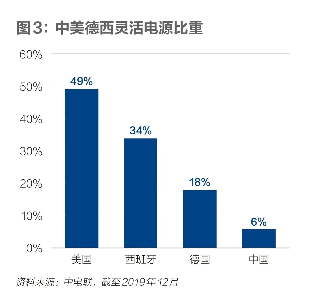 中電聯(lián)2019年12月發(fā)布的《煤電機組靈活性運行政策研究》顯示,歐美國家的靈活電源比重普遍較高,西班牙、德國、美國占比分別為34%、18%、49%,而中國占比不到6%。在中國新能源資源富集的三北地區(qū),風(fēng)電、太陽能發(fā)電裝機分別占全國的72%、61%,但靈活調(diào)節(jié)電源還不足3%。