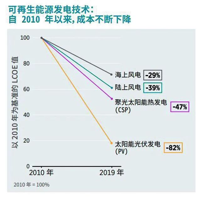 過去十年,光伏和風(fēng)電的度電成本分別下降了約八成和四成,且仍有進一步下降空間。