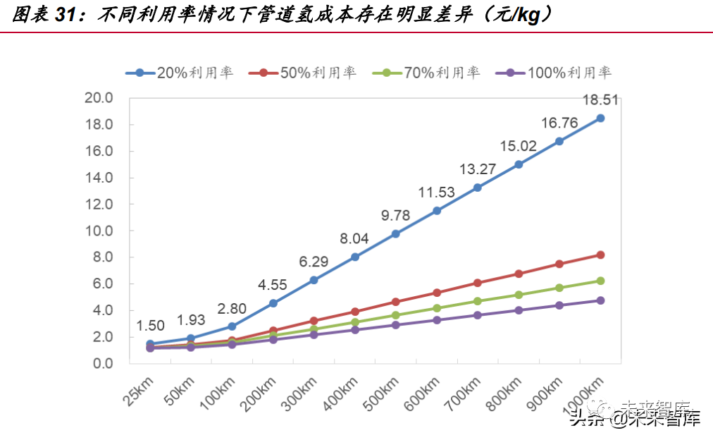 管道氫成本很大程度上受到需求端(利用率)的影響。在上述管道氫成本預(yù)測 中,我們假設(shè)管道運能的利用率達(dá)到 100%,在這種水平下,管道氫運輸成本表現(xiàn)出 非常低的水平,但隨著利用率水平的下降,管道氫成本陡然上升,當(dāng)運能利用率僅為 20%時,管道運氫的成本已經(jīng)接近長管拖車運氫。在當(dāng)前加氫站尚未普及、站點較為 分散的情況下,管道運氫的成本優(yōu)勢并不明顯。隨著氫能產(chǎn)業(yè)逐步發(fā)展,氫氣管網(wǎng)終 將成為低成本運氫方式的最佳選擇。
