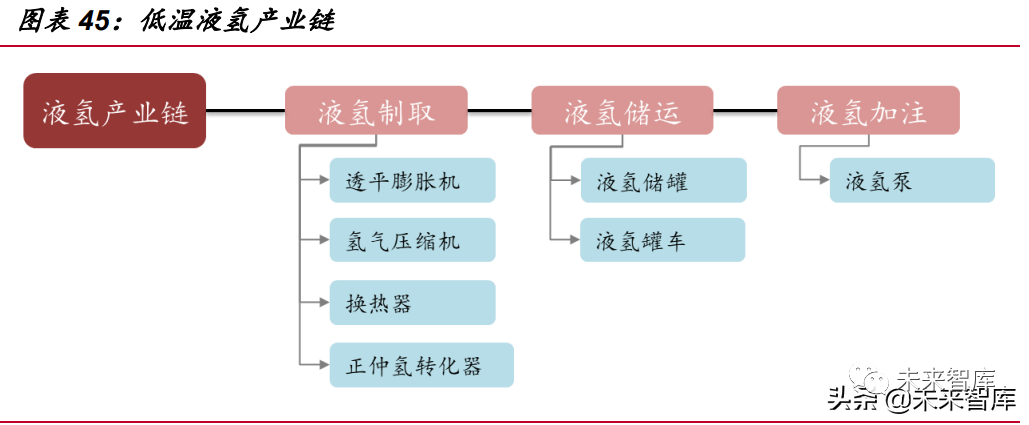 3)低溫液氫儲運儲氫能量密度高、運輸效率高,適用于中遠(yuǎn)距離輸送,目前主 要作為航空運載火箭推進(jìn)劑燃料,對儲氫裝置真空絕熱、減振抗沖擊、防泄漏性能要 求高,且深冷液化存在大量消耗、成本較高;