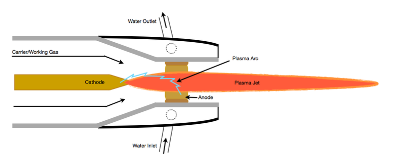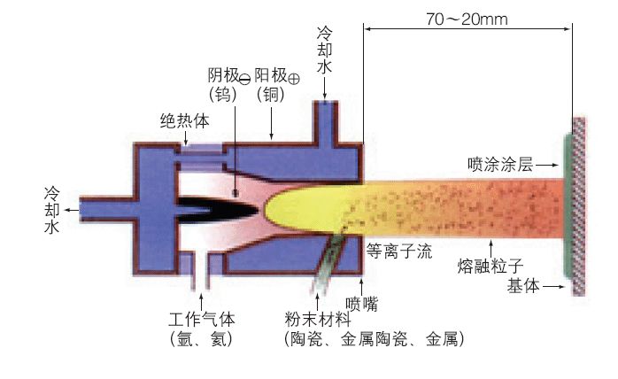 大氣等離子噴涂(APS)是應(yīng)用最早、最廣的一種熱噴涂技術(shù),整個(gè)噴涂過程在大氣環(huán)境下進(jìn)行。APS通常利用Ar、N2和He作為工作介質(zhì),其核心部件是等離子噴槍,工作原理是在陽極和陰極之間通入上述工作氣體作為介質(zhì),使其電離并產(chǎn)生等離子弧,通過等離子弧的作用進(jìn)一步將噴涂材料加熱至熔融或半熔融狀態(tài)后進(jìn)行噴涂。