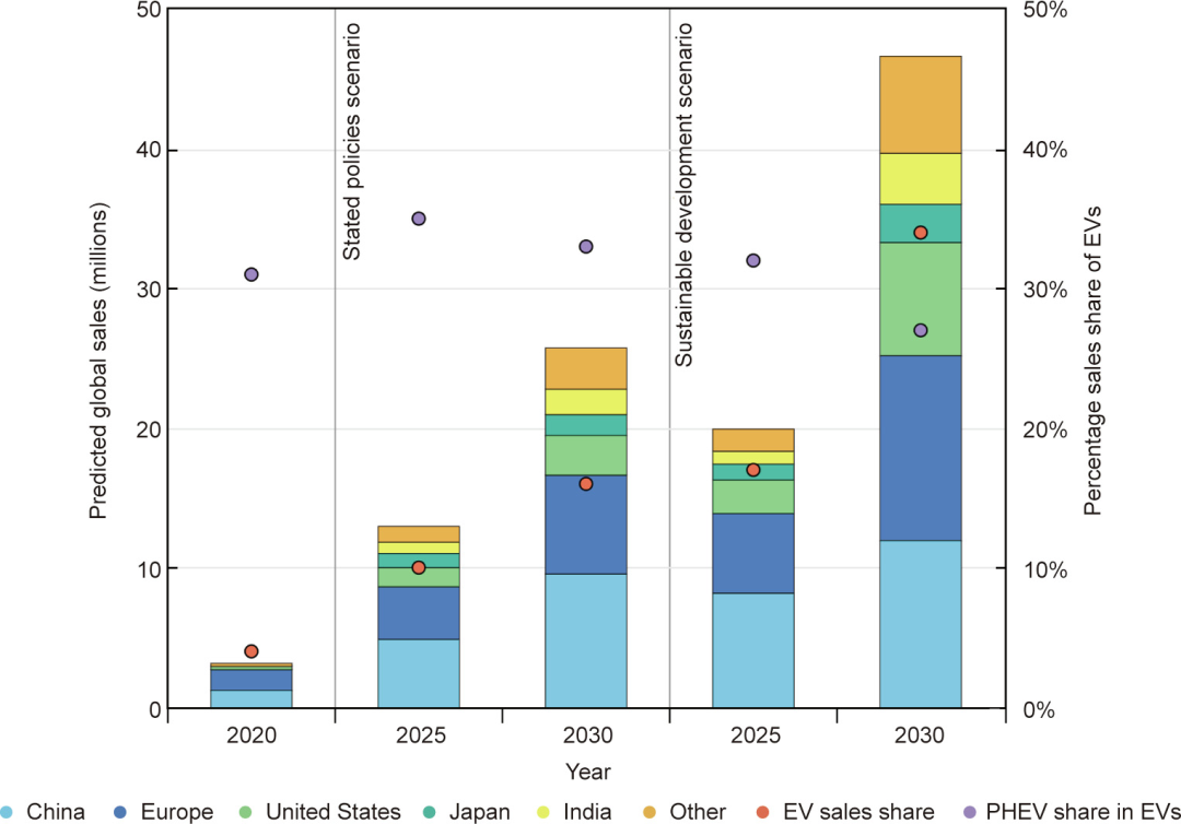 圖1 基于當前(2020年)公布的國家政策(中間和左側(cè)欄)和可持續(xù)發(fā)展形勢(右側(cè)欄),預(yù)計電動汽車國際銷量如圖所示。橙色圓圈代表電動汽車銷量占汽車總銷量的比例,紫色圓圈代表插電式混合動力電動汽車(PHEV)銷量在所有電動汽車銷量中所占的比例。來源:International Energy Agency,經(jīng)許可。