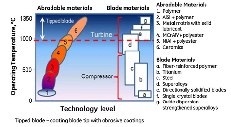 Fig 13 Requirements for abradable coating materials on different blade tips operating in different temperature ranges [36]