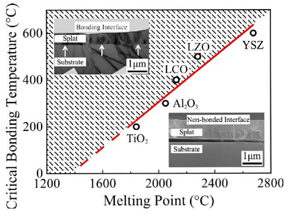 temperature for molten ceramic droplets to form bonding during spreading and melting point of spray material [39]