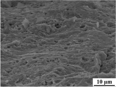 另一方面,依據(jù)圖 14 所 示結(jié)果,當(dāng)材料的熔點(diǎn)低于約 1500℃時,其臨 界溫度將降至室溫以下,這意味著可以在室溫噴 涂沉積粒子間充分結(jié)合的陶瓷涂層。采用熔點(diǎn)約 為 1370℃的鈦酸鉀制備的陶瓷涂層的斷裂面形 貌如圖 15 所示 [40],因粒子間結(jié)合充分而呈現(xiàn)與 傳統(tǒng)陶瓷涂層的層狀結(jié)構(gòu)完全不同的特征,反而 與燒結(jié)致密陶瓷塊材相同,該結(jié)果對推動陶瓷涂 層應(yīng)用的發(fā)展、拓展陶瓷涂層新的應(yīng)用領(lǐng)域具有 重要意義。