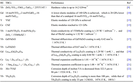 由于傳統(tǒng)的 YSZ 涂層已無法滿足新一代發(fā)動機更高的耐熱耐蝕要求,因此當(dāng)前高性能的熱障涂層研制工作集中在稀土摻雜改性的方向上。為提高YSZ涂層的耐 Na2SO4 + V2O5熱腐蝕性,Song等摻雜微量的稀土元素Yb、Gd,制備了5.6Yb2O3-5.2Gd2O3-9.5Y2O3-ZrO2(YGYZ)涂層。結(jié)果表明1374.15K熱腐蝕20h后,YGYZ 涂層 中 m-ZrO2的降解程度僅為 YSZ 涂層的 40% 左右,且 YGYSZ涂層具有較高的四方性。為改善La2Zr2O7 涂層的熱導(dǎo)率,Gul等在該涂層中摻雜了稀土元素 Ce,發(fā)現(xiàn)Ce元素的摻雜對La2Zr2O7涂層的熱導(dǎo)率影響很大。1574.15 K 時,La16Zr14Ce2O56 涂層的熱導(dǎo)率約為0.80W/(m?K),遠(yuǎn)低于La2Zr2O7涂層(1.26W/(m?K))??梢?,稀土元素?fù)诫s有利于涂層性能的提高。為了更好地對比稀土摻雜涂層材料的性能優(yōu)勢,將它們的性能列入表1。由表1可以看出,不同稀土元素?fù)诫s,涂層性能的改善程度也不相同。這可能是因為稀土元素之間存在離子半徑、原子質(zhì)量、電負(fù)性等差異。同時也發(fā)現(xiàn),對于熱障涂層材料,可通過摻雜適當(dāng)稀土元素實現(xiàn)高溫相穩(wěn)定性、力學(xué)、熱物理以及抗熔鹽腐蝕等性能的改善,以獲得高性能涂層。
