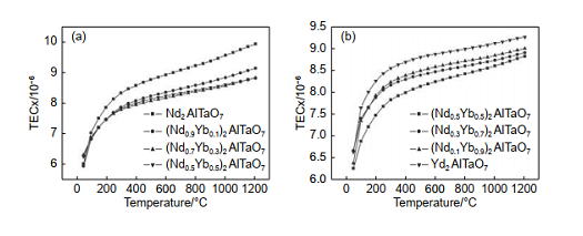Zhang 等研究對比(Nd1-xYbx)2AlTaO7(x =0,0.1,0.3,0.5,0.7,0.9,1)涂層的熱膨脹系數(shù)變化時,發(fā)現(xiàn) x < 0.5 時,該涂層的熱膨脹系數(shù)隨 x 的增大而降低且變化程度逐漸變緩,x > 0.5 時,為相反趨勢(圖 2(a),(b))。其原因在于稀土元素 Yb 相對于 Nd 有著較小的離子半徑、較大的電負(fù)性,引起晶格能增加和 IRE-O 鍵強降低。并在 x = 0.5 時,這種綜合影響基本相互抵消,該涂層的熱膨脹系數(shù)達到最低,1474.15K時,為 8.8×10-6K-1, 而Nd2AlTaO7 涂層 在 1474.15 K 時的熱膨脹系數(shù)為9.9×10-6K-1。這說明電負(fù)性、離子半徑較大的稀土元素?fù)诫s有利于涂層熱膨脹系數(shù)的提高?;陔娯?fù)性、離子半徑選擇稀土元素?fù)诫s,從而改善涂層的熱膨脹系數(shù)。目前利用稀土元素?fù)诫s實現(xiàn)涂層熱膨脹系數(shù)顯著提高的相關(guān)研究較少,而且,通過稀土元素?fù)诫s同時降低化學(xué)鍵強和晶體能的研究仍需進一步深入。