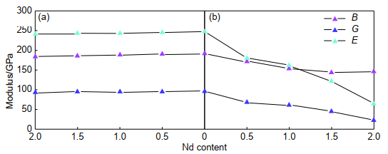 Zhao 等選擇稀土元素 Nd 進行摻雜,構(gòu)建了 Gd2-xNdxZr2O7、Gd2Zr2-xNdxO7( x = 0.0,0.5,1.0,1.5, 2.0) 。 通 過 模 擬 研 究 發(fā) 現(xiàn) , Nd 摻 雜 替 代Gd2Zr2O7 涂層中部分的 Zr 時,其塊體模量、剪切模量、楊氏模量有了很大的降低,x = 2 時,其塊體模量、剪切模量和楊氏模量達到最小值,比未摻雜的Gd2Zr2O7 涂 層 分 別 下 降 了 近 24%、 77%、 74%(圖 4)。隨后,Zhao 等擇取 Yb 為摻雜元素,系統(tǒng)性地研究了 Gd2-xYbxZr2O7(x = 0.0,0.5,1.0,1.5,2.0)涂層彈性模量的變化。研究發(fā)現(xiàn) x < 2 時,該涂層的彈性模量均低于未摻雜的 Gd2Zr2O7 涂層;x = 0.5 時,其塊體模量、剪切模量、楊氏模量值最低 , 分別為179.0 GPa、 88.9 GPa、 228.8 GPa。而Gd2Zr2O7 涂層的塊體模量、剪切模量、楊氏模量值分別為191.8 GPa、96.2 GPa、243.7 GPa,Yb2Zr2O7涂層塊體模量、剪切模量、楊氏模量值分別為206.5GPa、106.8 GPa、273.3 GPa。該作者又對比研究了Gd2Zr2O7 和 Yb2Zr2O7 涂層晶體結(jié)構(gòu)的彈性常數(shù),結(jié) 果 表 明 Yb2Zr2O7 晶 體 結(jié) 構(gòu) 的 彈 性 常 數(shù) ( C11、C12、C44)均大于 Gd2Zr2O7。因此 Yb 作為摻雜元素,降低 Gd2Zr2O7 涂層彈性模量的程度較低,而Gd 作為摻雜元素,大幅度降低了 Yb2Zr2O7 涂層的彈性模量。這些結(jié)果再次說明了稀土元素?fù)诫s可有效降低涂層的彈性模量。未來可基于同種晶體結(jié)構(gòu),選擇彈性常數(shù)較低的稀土元素進行摻雜,從而大幅度地降低涂層的彈性模量。