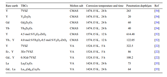 通過上述分析,稀土摻雜可以一定程度上提高涂層抗 CMAS 能力以及化學(xué)惰性,在熱物理性能與力學(xué)性能提高的輔助下,摻雜的涂層不僅能夠滿足下一代高性能航空發(fā)動機的技術(shù)要求,同時對于未來新型熱障涂層的進一步改性提供可行性參考。