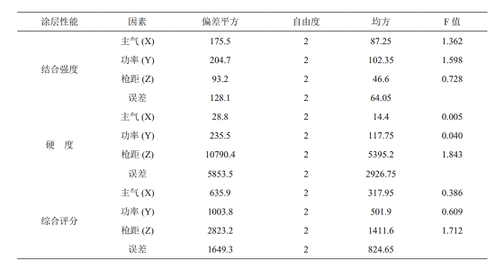 影響涂層質(zhì)量的力學(xué)性能指標(biāo)主要包括結(jié)合強(qiáng)度和顯微硬度。表 5 為不同工藝 C276-Ni60 涂層的結(jié)合強(qiáng)度和顯微硬度,采用極差法來分析,涂層的力學(xué)性能通過計(jì)算綜合加權(quán)評(píng)分的方法來評(píng)價(jià)。根據(jù)極差的大小,可以判斷出各個(gè)因素對(duì)涂層力學(xué)性能影響的主次順序,極差越大,則說明該因素對(duì)性能的影響越大。另根據(jù)方差法可以定量分析各個(gè)因素對(duì)涂層質(zhì)量的影響程度,彌補(bǔ)直觀分析的不足,并通過 F 值來檢驗(yàn)。